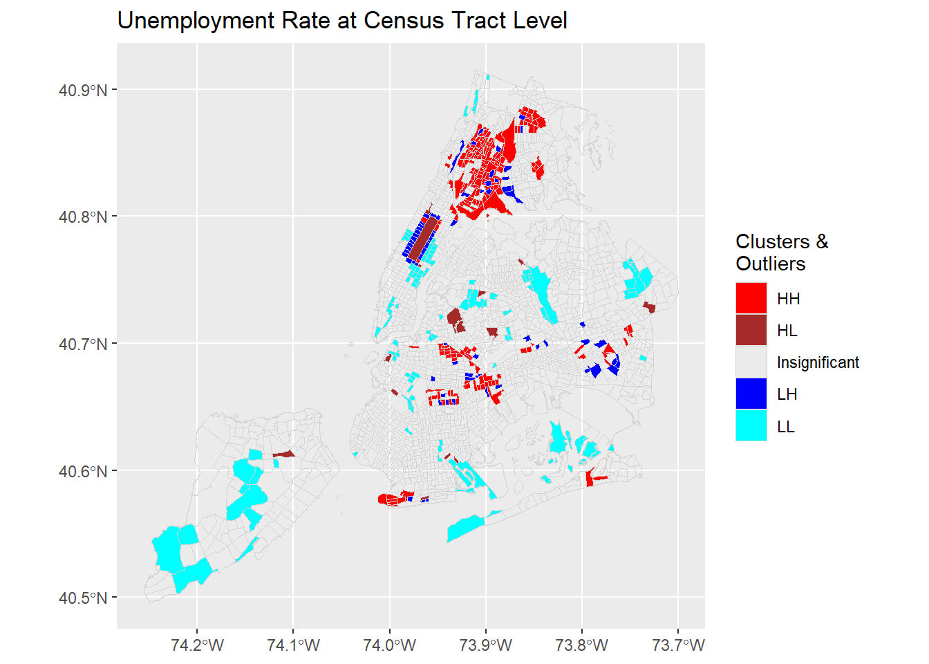 zero.policy = TRUE)The Moran’s I test shows a positive statistic of 0.275. And it is also statistically significant with a near zero p-value. Because the p-value < 0.01, we are 99% confident that the unemployment rates are not spatially independent from those in their neighboring census tracts. And a positive Moran’s I implies the unemployment rate of a census tract tends to be similar to its neighboring tracts, which is what we expect.