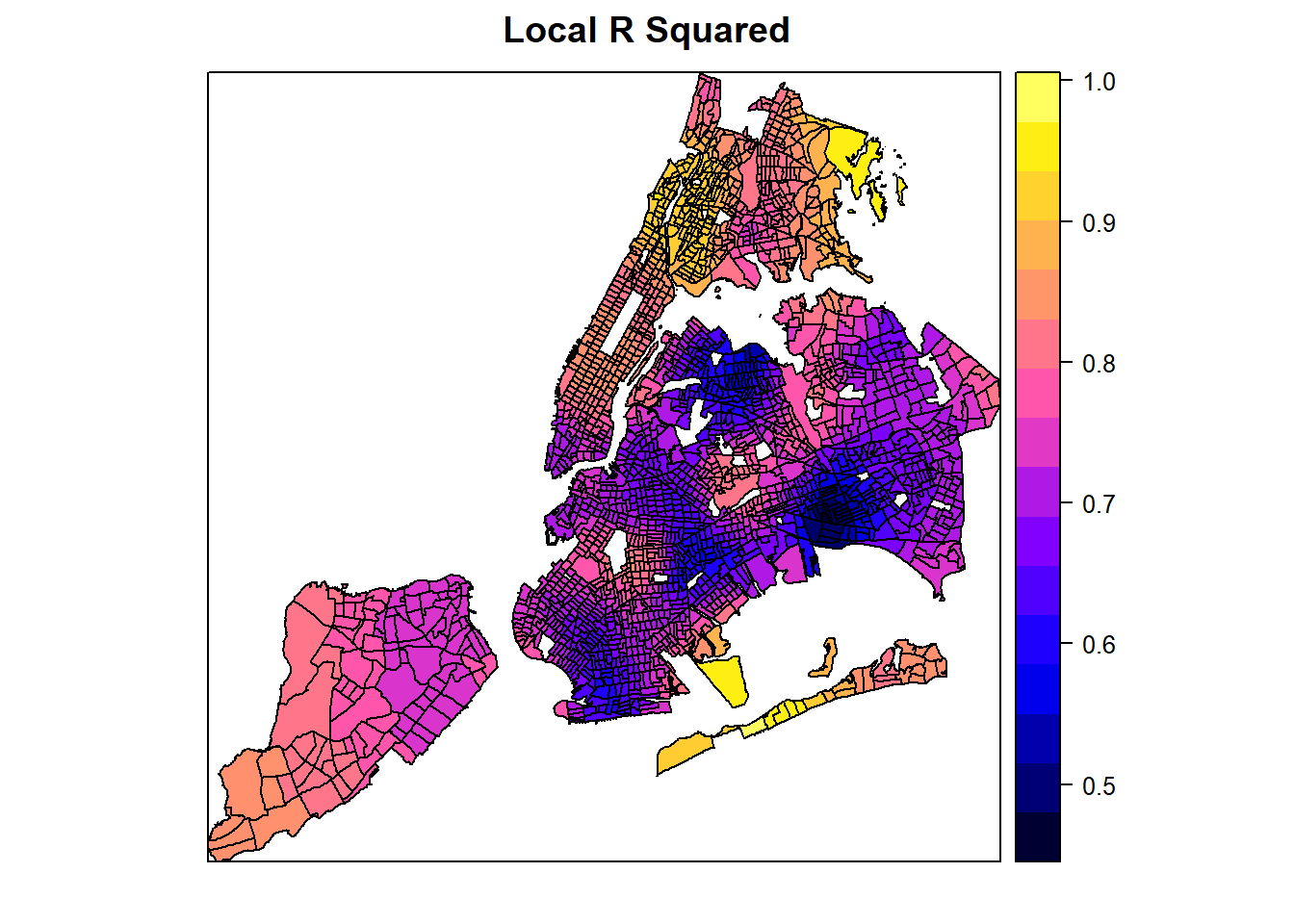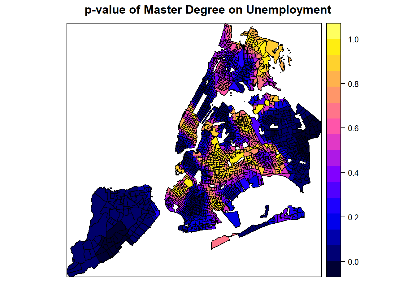From these plots, it seems like a master degree, while helping reduce unemployment overall with statistical significance, may not matter at some places (where p-value is high). Additionally, it can also positively contribute to unemployment at some areas, even though the master degree factor is mostly not significant at those areas. Similarly, the number of population with an education of high school or less in the labor force may positively or negatively contribute to the unemployment, depending on the locations. Clearly, GWR is a powerful exploratory tool as we instantly want to know why such spatial variation exists and what might explain it. Such exploration would continue in advanced R topics, but the book has to stop here.