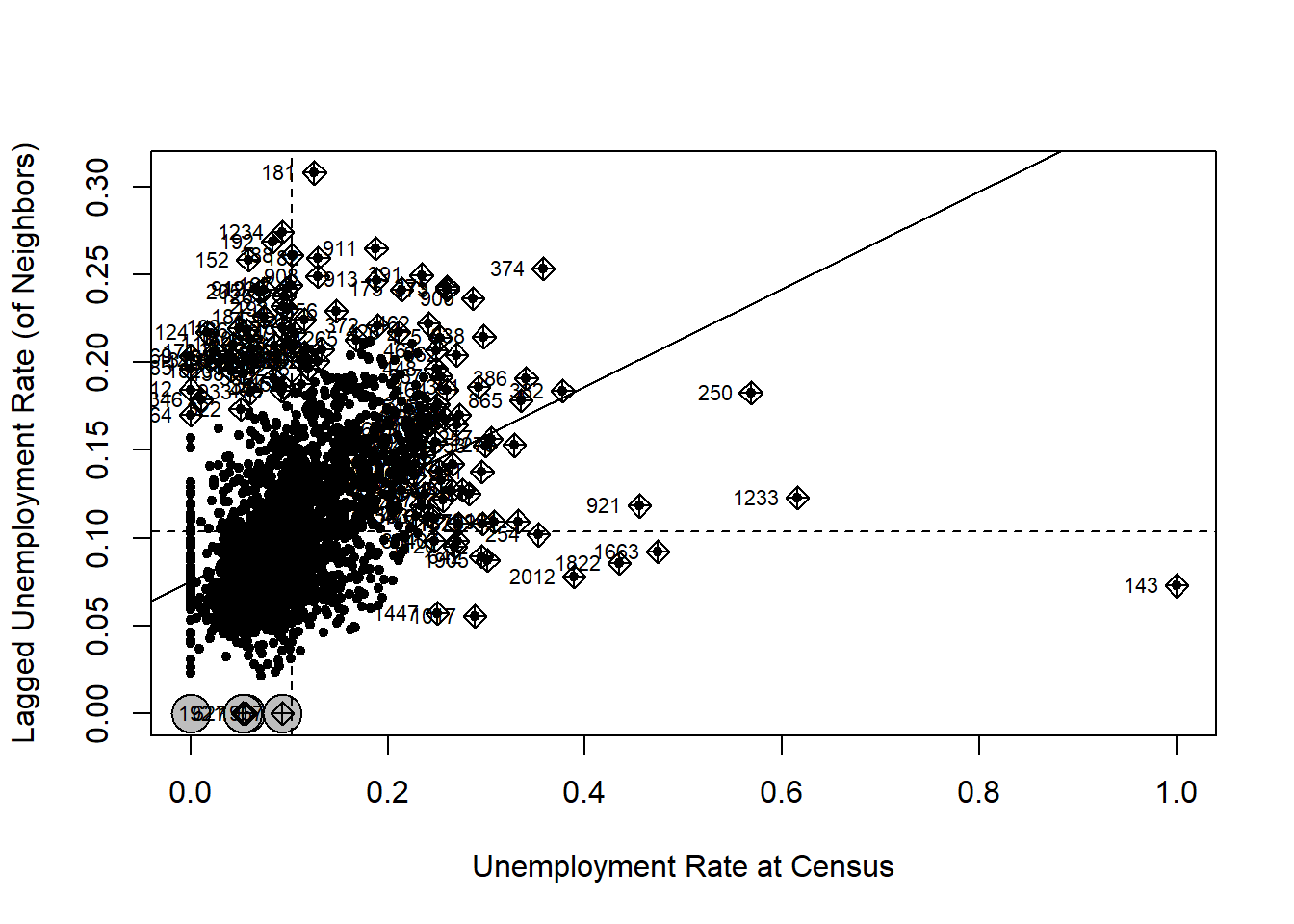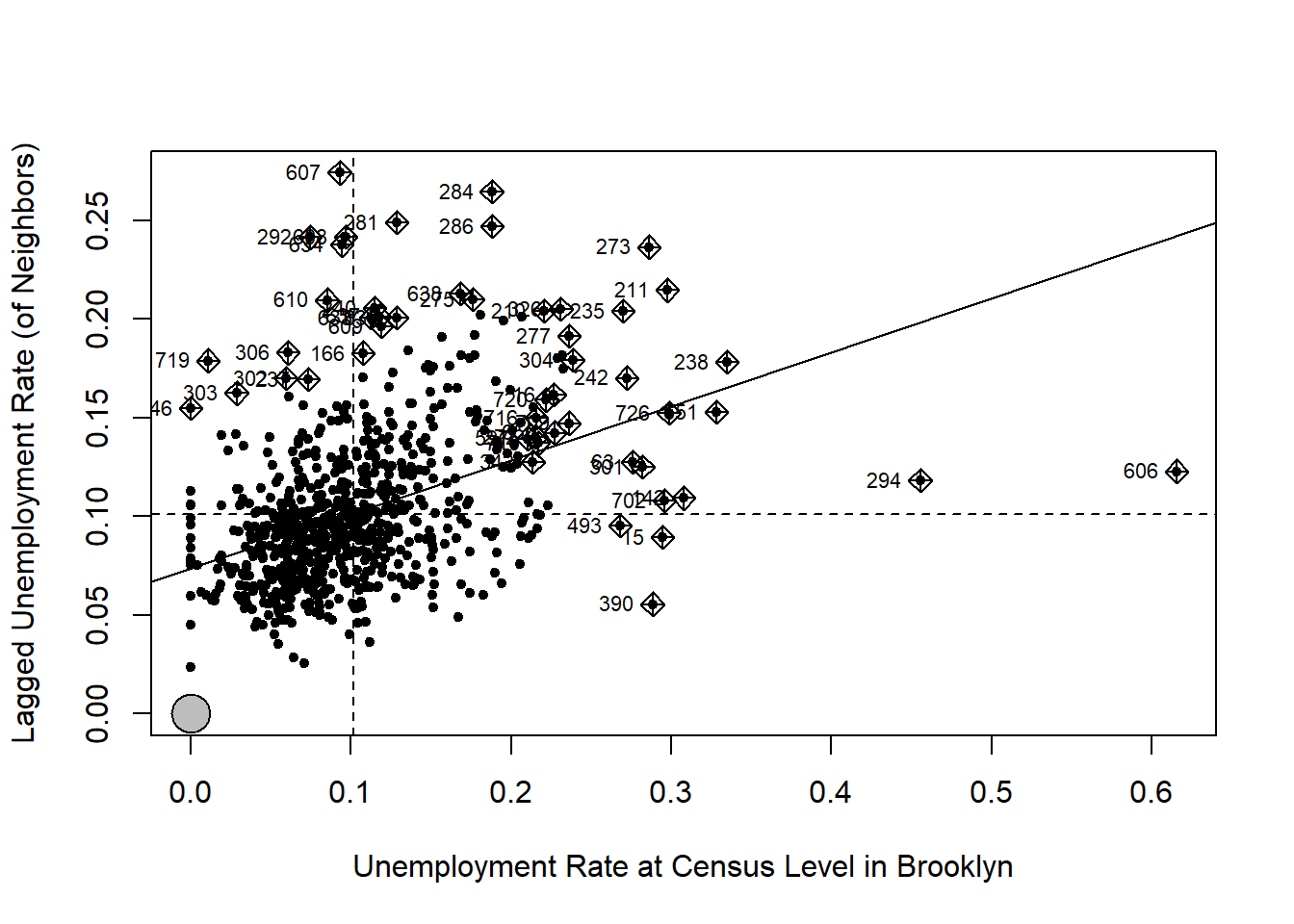 The two dashed lines in the figure divide the plot into four quadrants. All the points in the upper right quadrant have higher-than-mean unemployment rates. Their neighbors also have higher-than-mean rates. The points in the bottom left quadrant have lower-than-mean values, both for census tracts and their neighbors. By contrast, the census tracts that fall into the bottom right quadrant have high-than-median values but their neighbors have lower-than-mean values. Similarly, those in the upper left quadrant have lower-than-mean values but their neighbors have high-than-mean values.